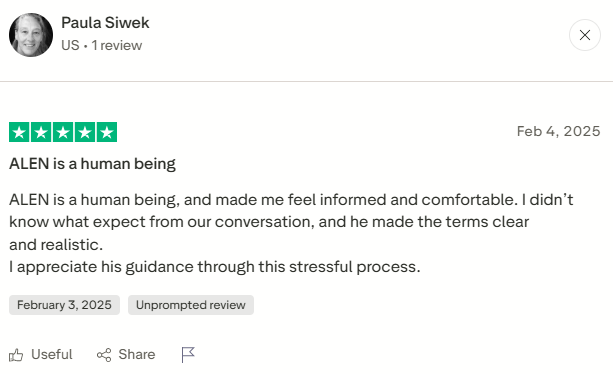 Paula Siwek captured this: “ALEN is a human being, and made me feel informed and comfortable. I didn’t know what expect from our conversation, and he made the terms clear and realistic.”