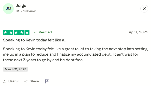 Jorge expressed this perfectly: “Speaking to Kevin today felt like a great relief to taking the next step into setting me up in a plan to reduce and finalize my accumulated dept. I can’t wait for these next 3 years to go by and be debt free!”