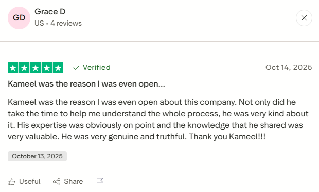 Grace D shared: “Kameel was the reason I was even open about this company. Not only did he take the time to help me understand the whole process, he was very kind about it. His expertise was obviously on point and there were no questions he was unable to answer.”